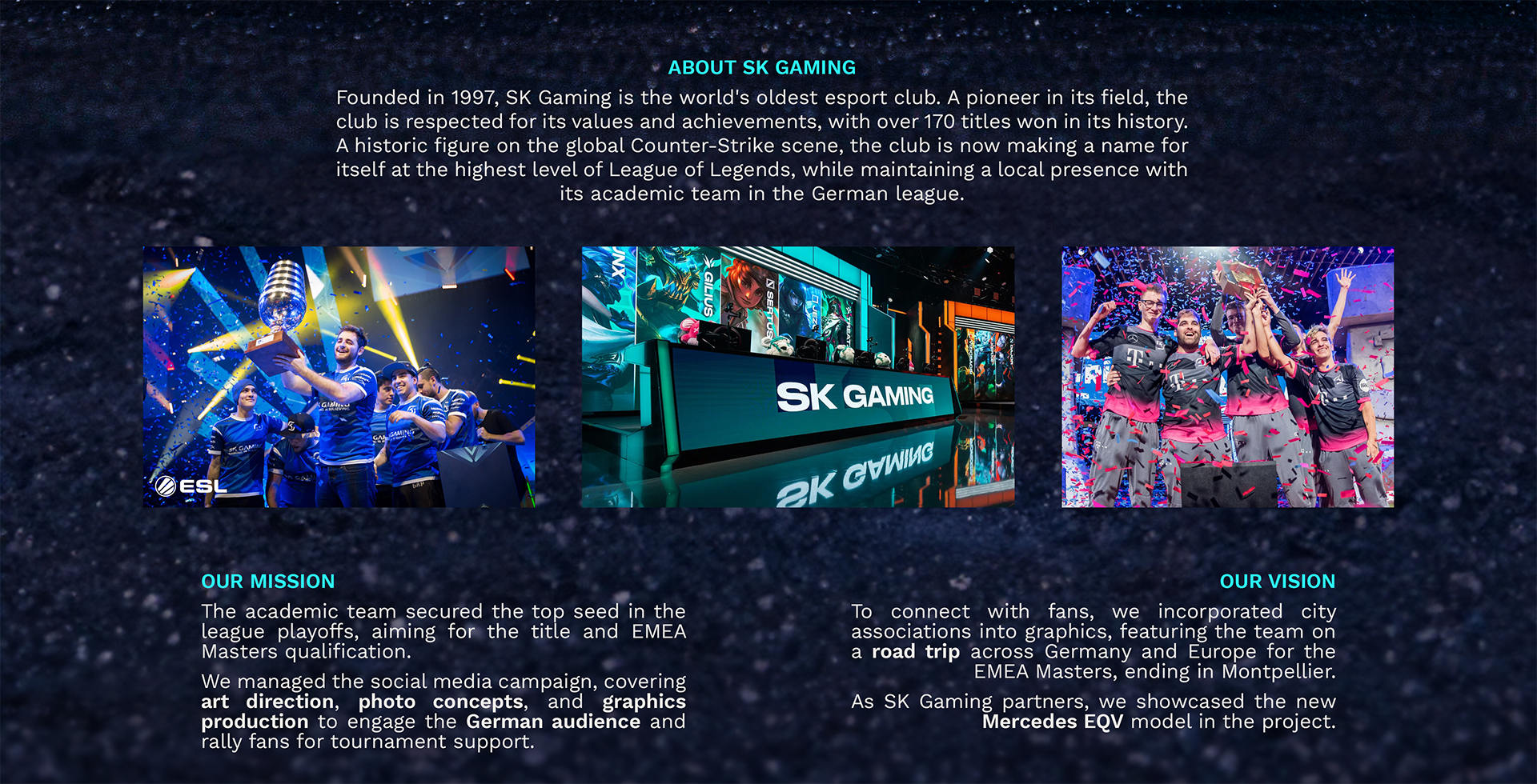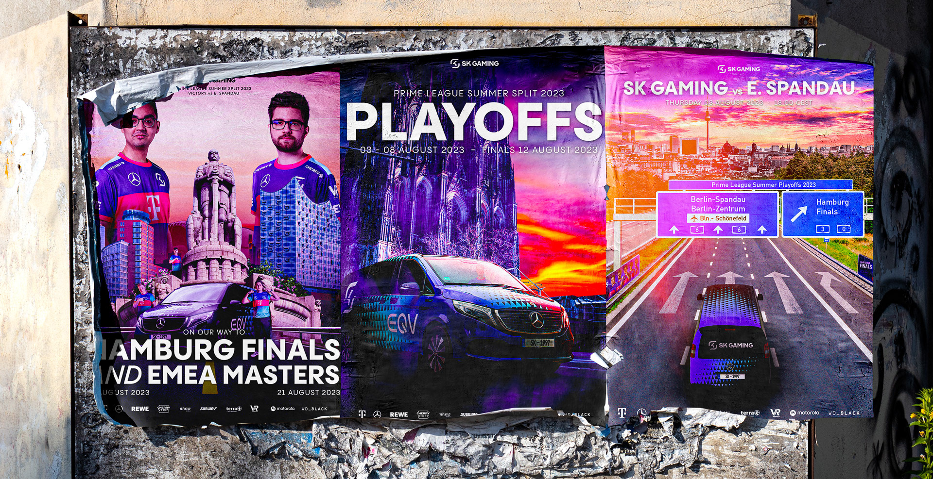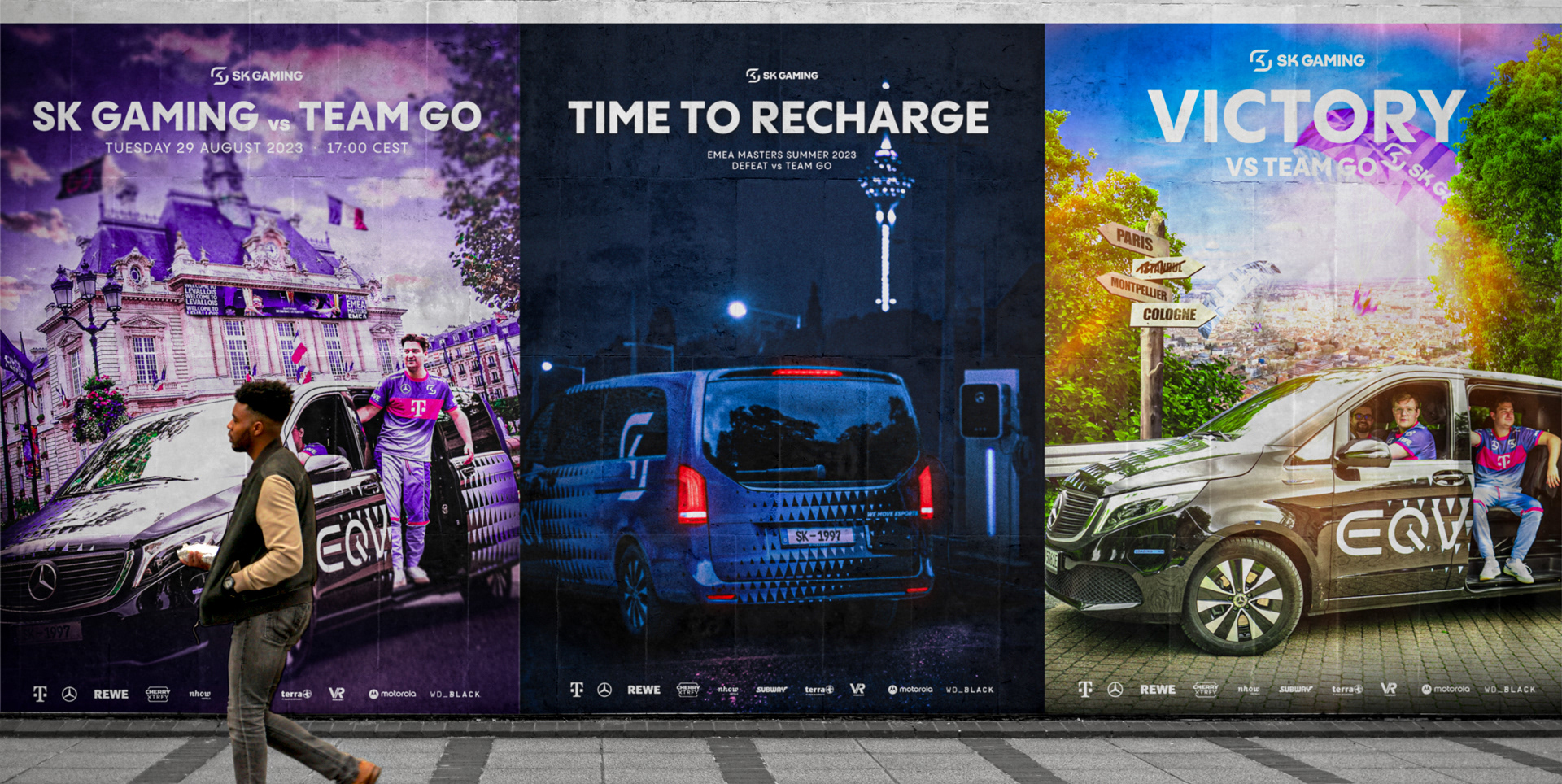 This campaign aims to promote the journey of SK Gaming League of Legends academy team through its journey in the Prime League playoffs and EMEA Masters. Every club being identified to a city, we wanted to implement this geographic aspect into the graphics to help the fans relating to them. We therefore decided to go with a strong concept of making the team do a roadtrip across Germany to face their opponents on their own and extend the ride to Europe for the EMEA Masters with a clear destination, the city where the final will be held: Montpellier. As one of the key partners of SK Gaming, we found it compelling to feature the new Mercedes EQV model in the project.