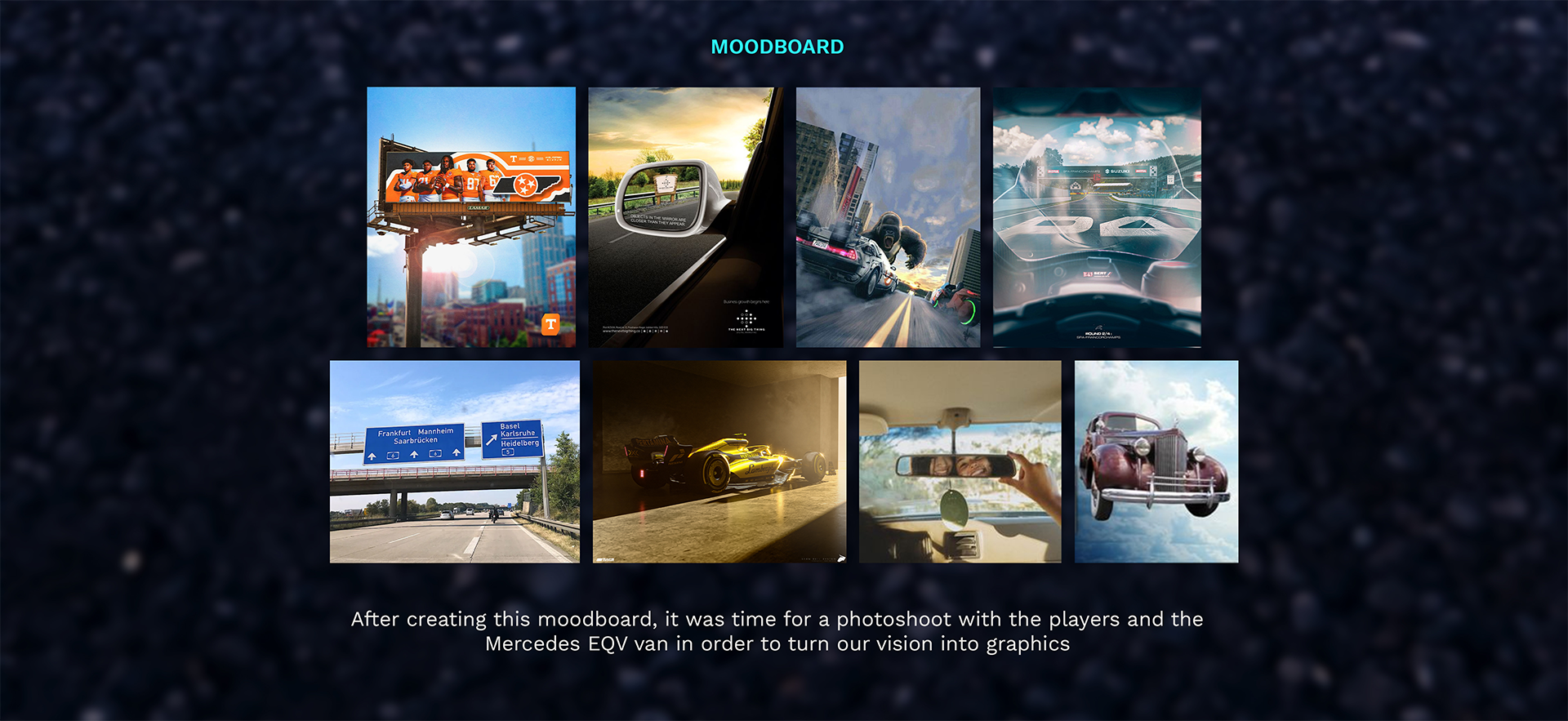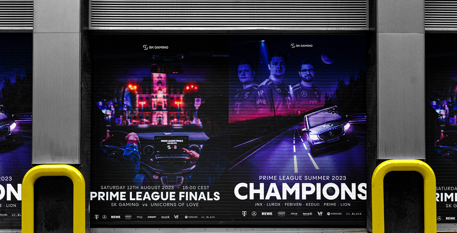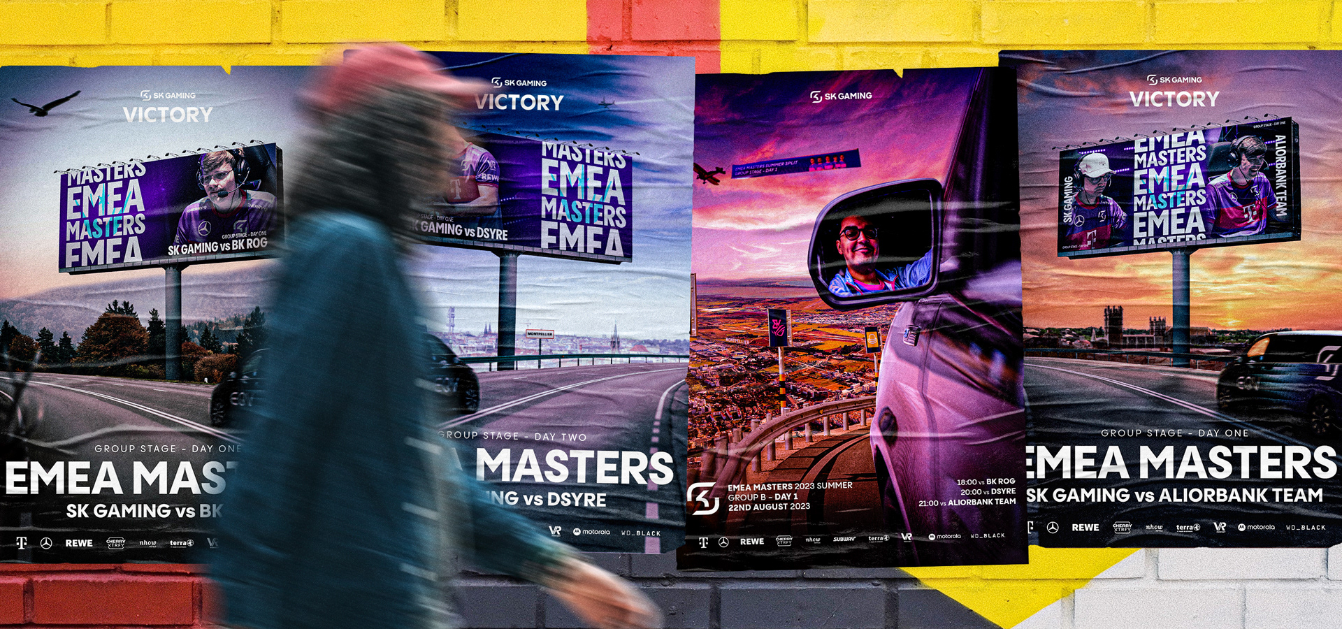 This campaign aims to promote the journey of SK Gaming League of Legends academy team through its journey in the Prime League playoffs and EMEA Masters. Every club being identified to a city, we wanted to implement this geographic aspect into the graphics to help the fans relating to them. We therefore decided to go with a strong concept of making the team do a roadtrip across Germany to face their opponents on their own and extend the ride to Europe for the EMEA Masters with a clear destination, the city where the final will be held: Montpellier. As one of the key partners of SK Gaming, we found it compelling to feature the new Mercedes EQV model in the project.